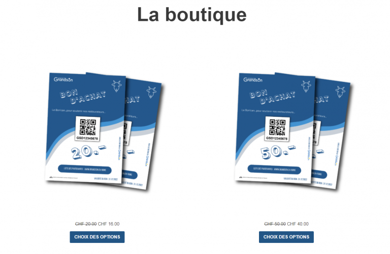 Les bons, d’une valeur de CHF 20.-, 50.- et 100.- sont vendus avec une réduction de 20% ! Après paiement, ils sont instantanément téléchargeables en format PDF, à imprimer ou à présenter depuis son téléphone.