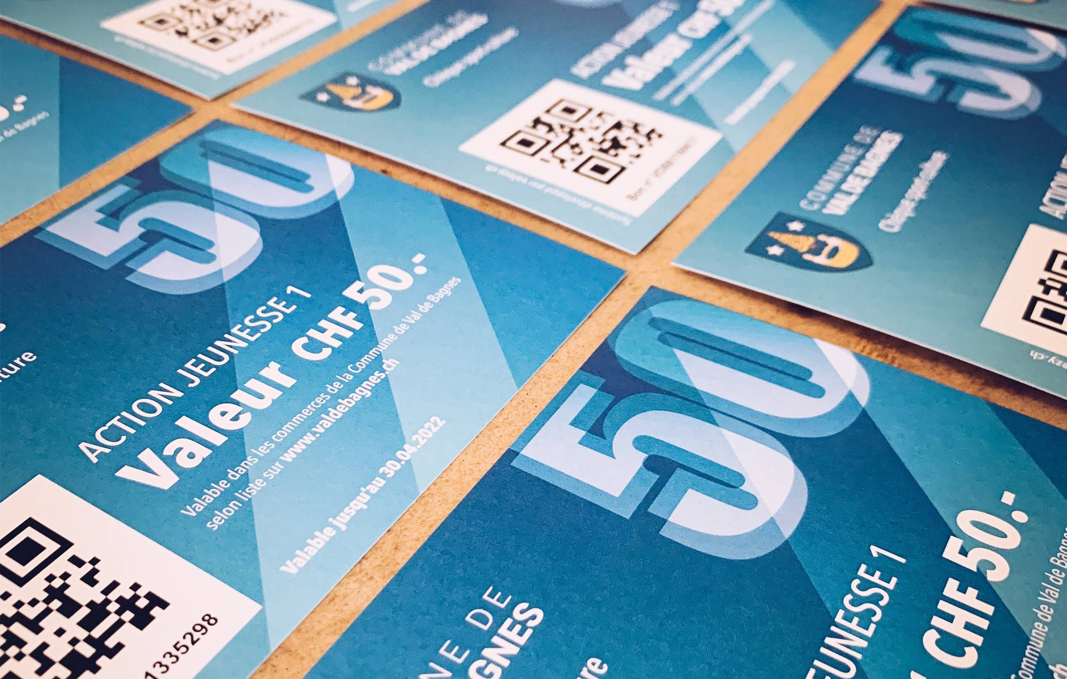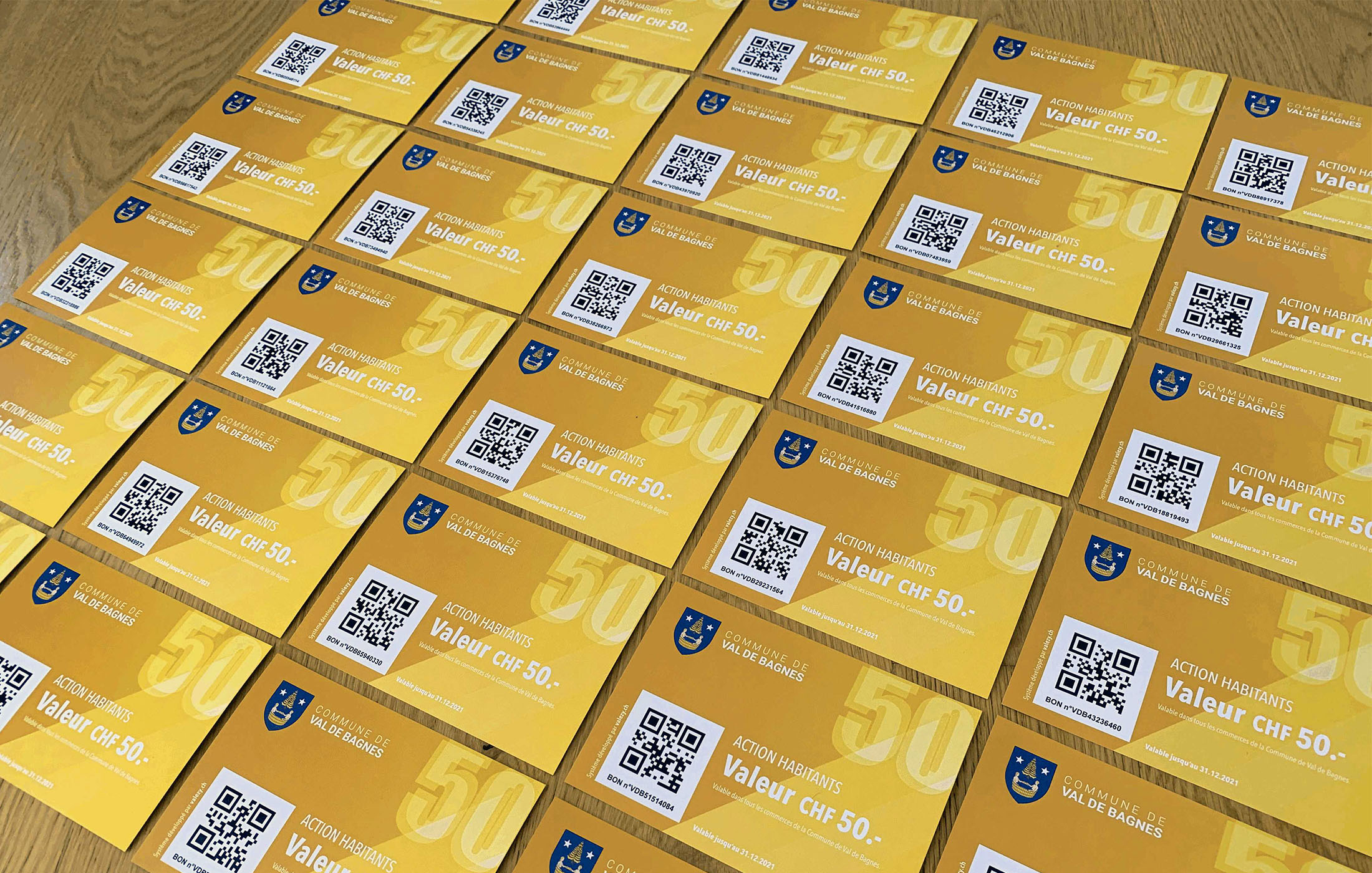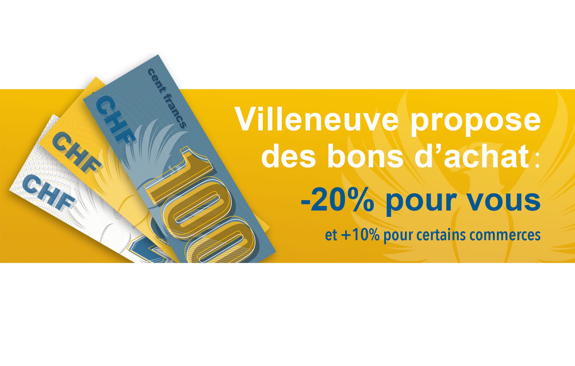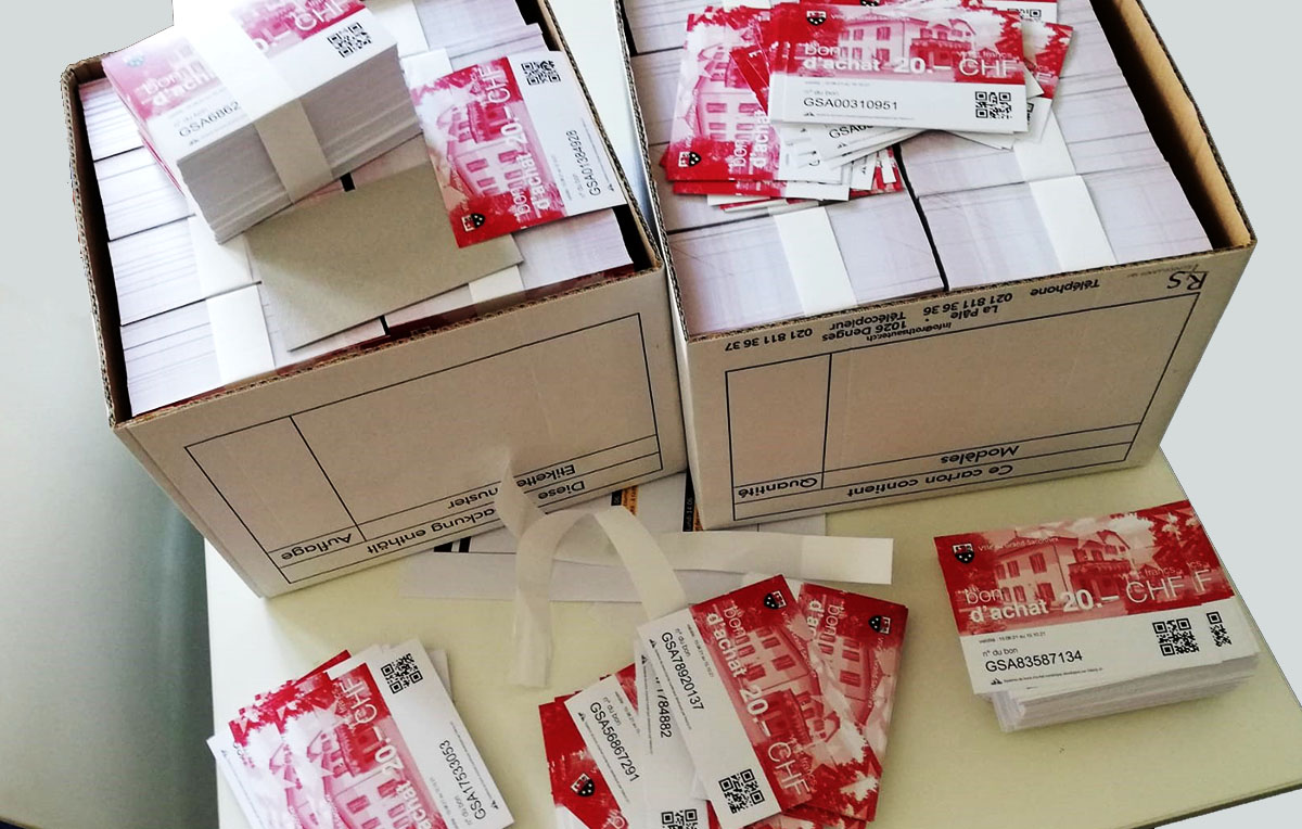 Vente de bons d’une valeur de CHF 100.-, CHF 50.- et CHF 20.- avec une réduction de 20% offerte par la Commune. Certains commerces perçoivent 10% de supplément lors du remboursement.